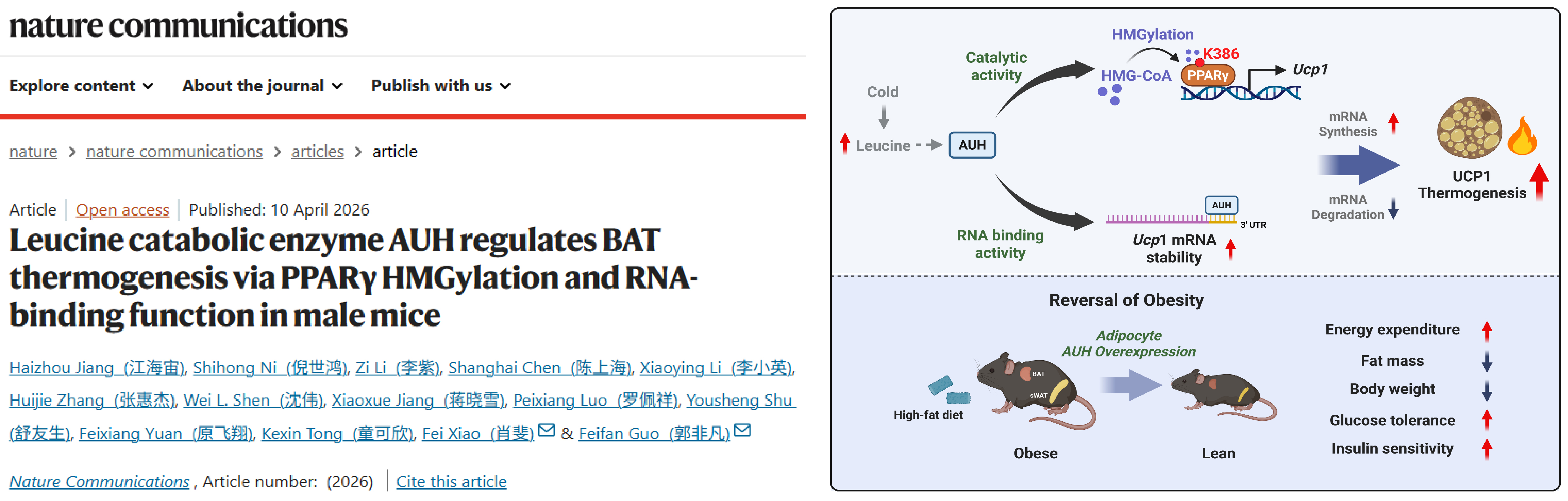Nature Communications | 复旦大学郭非凡/肖斐团队发现亮氨酸代谢关键酶AUH调控褐色脂肪产热新机制