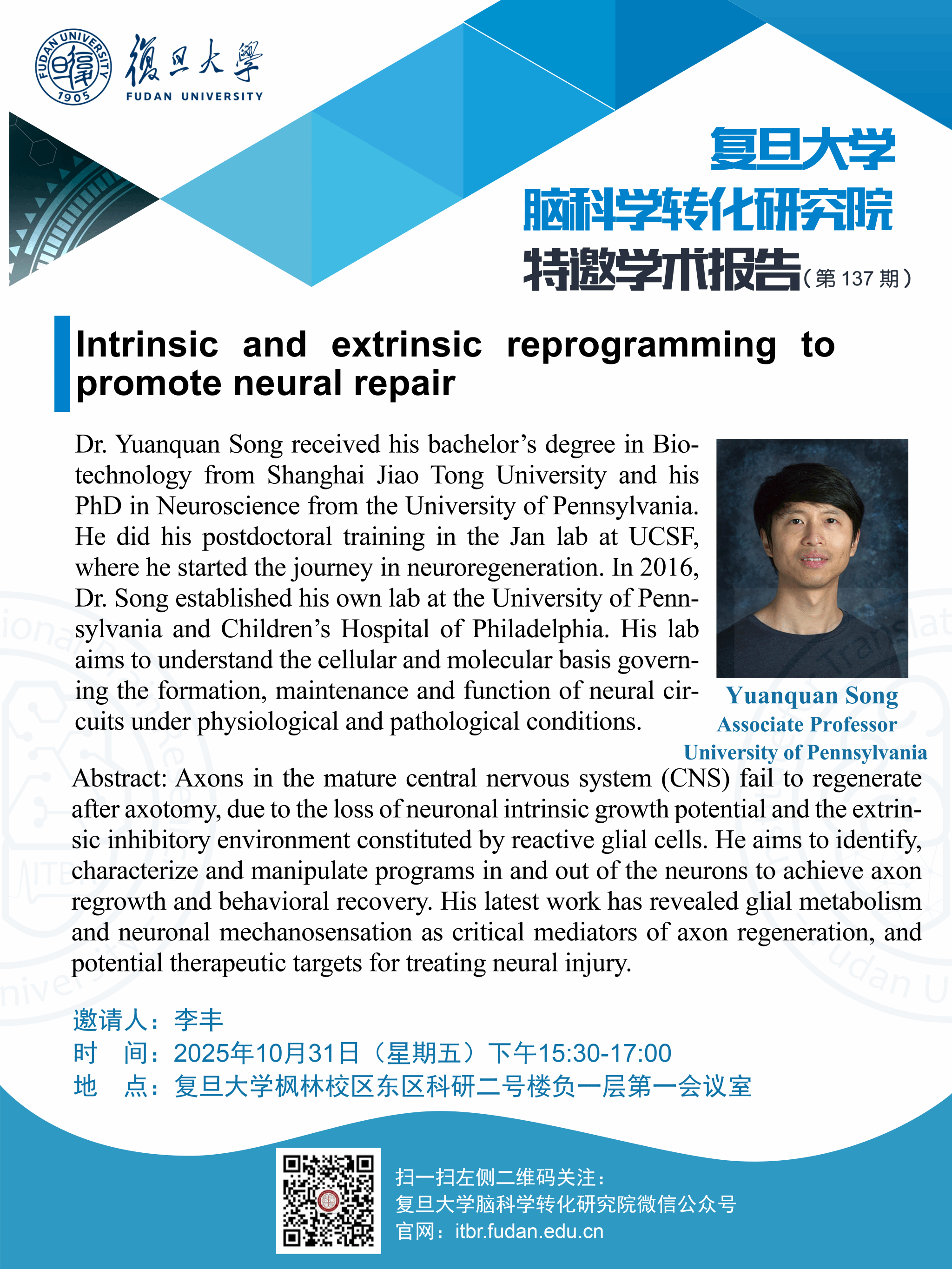 学术报告第137期:Intrinsic and extrinsic reprogramming to promote neural repair-复旦大学脑科学转化研究院