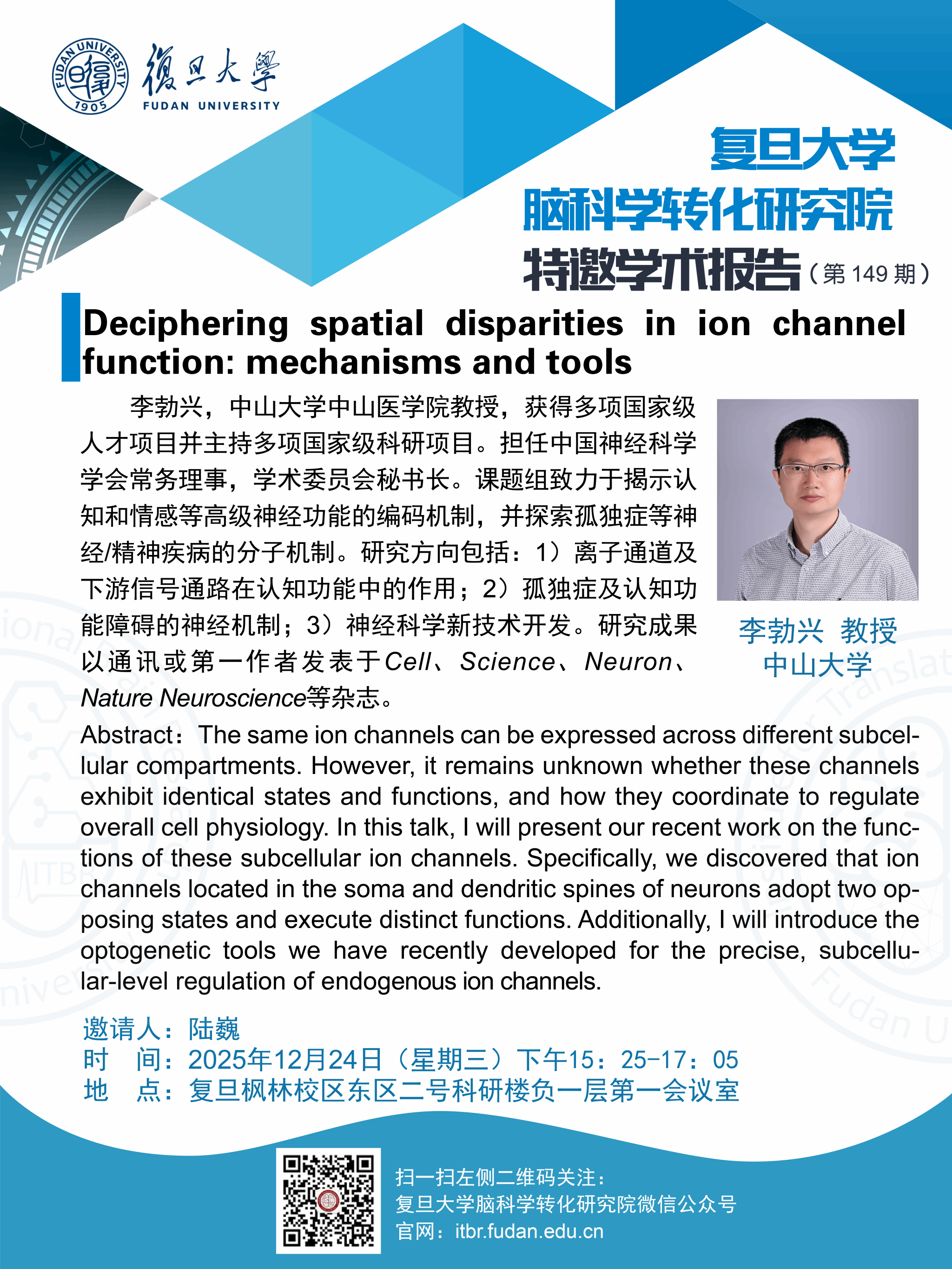 学术报告第149期:Deciphering spatial disparities in ion channel function: mechanisms and tools