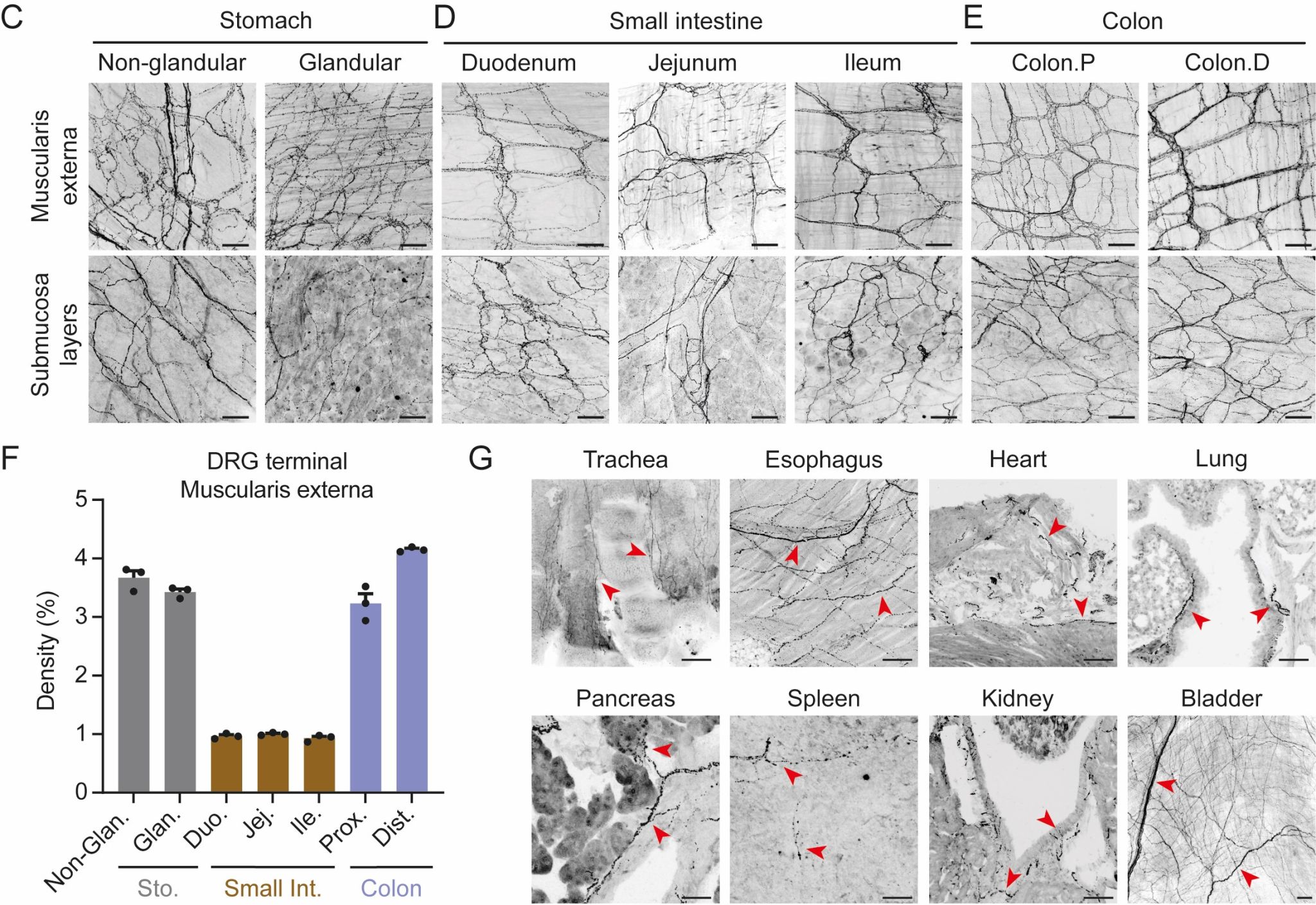 图1:DRG感觉神经元在各种内脏中的投射末梢