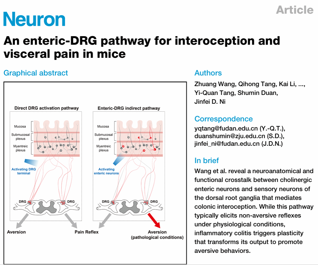 2025年10月24日,复旦大学脑科学转化研究院倪金飞课题组在Neuron上在线发表了题为” An enteric—DRG pathway for interoception and visceral pain in mice ”的研究论文,该研究揭示了肠道神经系统与DRG感觉神经通路之间存在一种新的神经解剖学与功能交互机制。