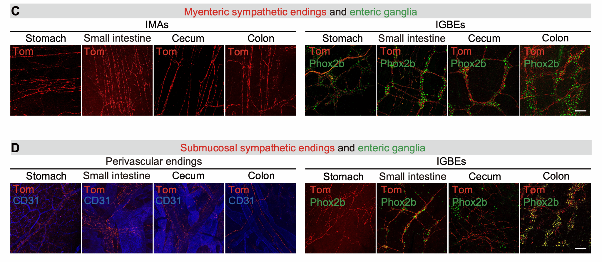 腹腔-上肠系膜交感神经节中包含交感神经节后神经元,为各种腹部器官提供交感神经支配,形成多种神经末梢。尤其是在胃肠道的投射图谱中,我们发现CG-SMG对胃肠道的肌间层和粘膜下层均有投射,并且存在多种投射末梢类型:IMAs、IGBEs、perivascular endings和Villi endings ,不同CG-SMG神经末梢类型可能对应调控不同的生理功能(图1)。