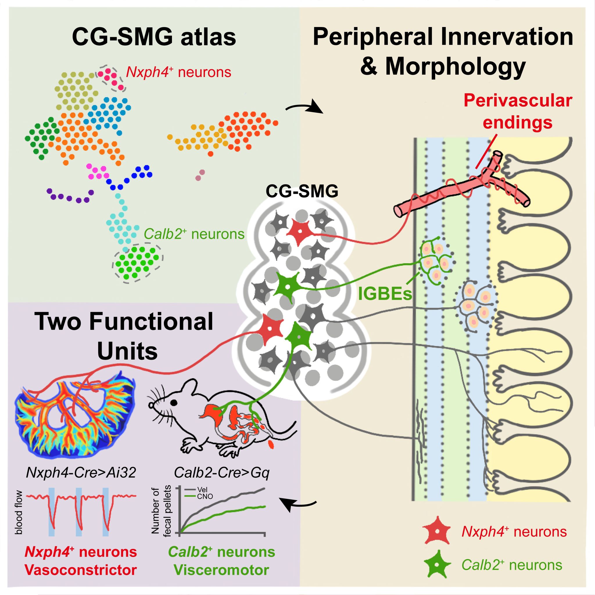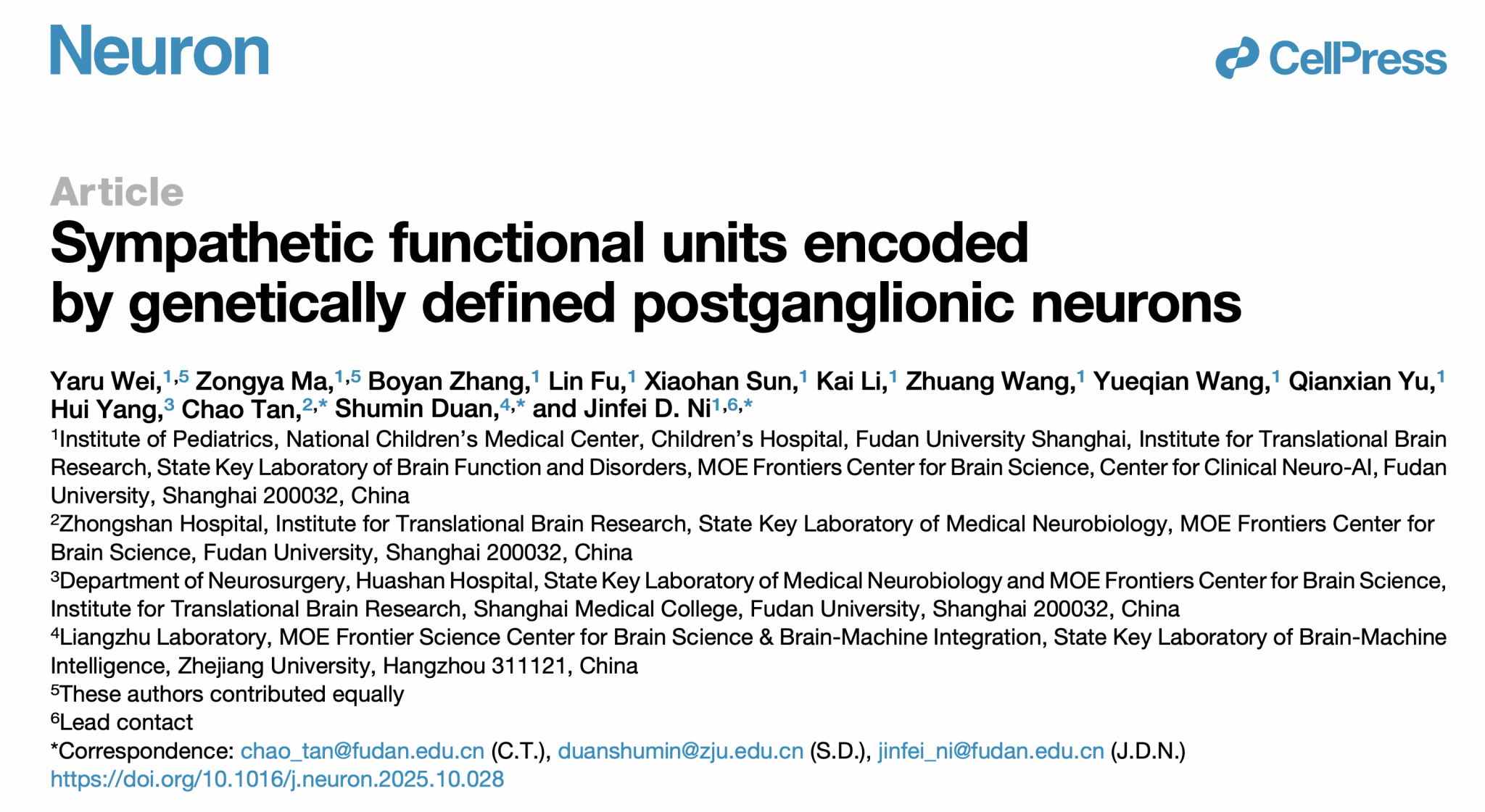 2025年12月10日,复旦大学脑科学转化研究院倪金飞、段树民、谭超课题组在Neuron上在线合作发表了题为“Sympathetic functional units encoded by genetically defined postganglionic neurons”的研究论文,该研究以腹腔交感神经节为研究对象,系统探索了交感功能单元的组织形式。首次揭示调控胃肠蠕动与内脏血管收缩的功能分别由两群不同的交感节后神经元承担。这两群神经元在基因表达、末梢形态上均表现出显著差异。该发现不仅首次在细胞类型层面证实了不同交感功能单元的存在,更为进一步解析大脑如何通过功能单元的组合实现器官功能的精准调控提供了关键突破口。