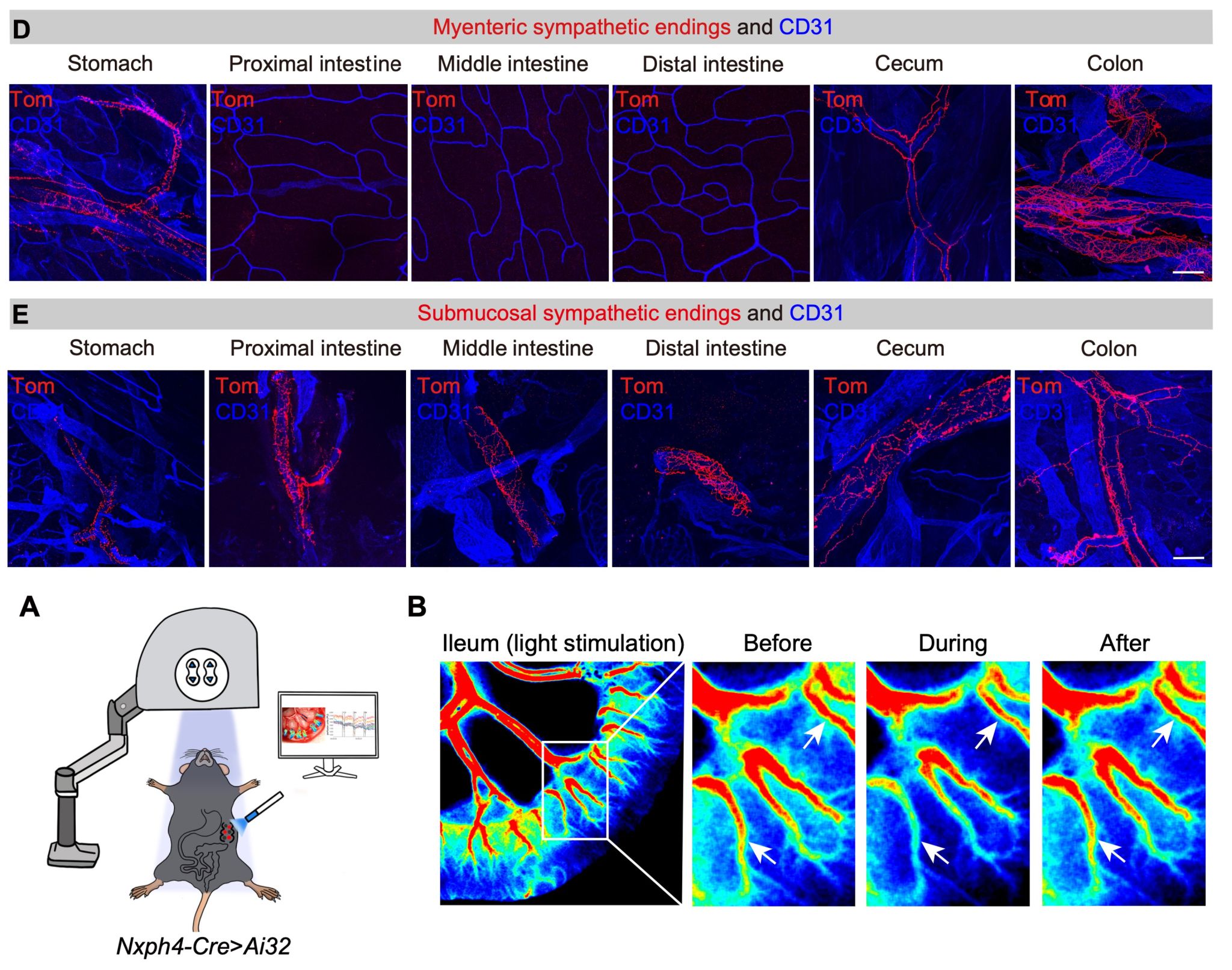通过分析CG-SMG中的Nxph4阳性神经元的投射特征,我们发现其在胃肠道及其他的腹腔器官中均形成围绕在血管周围的末梢类型(perivascular endings)。据此,我们合理推测Nxph4阳性神经元可能在调控血管收缩舒张中起到重要的调节作用。进一步通过光遗传激活CG-SMG中的Nxph4阳性神经元,在给光期间,小鼠肠道血管会出现明显的收缩现象,血流灌注量明显下降。而光遗传激活Calb2阳性神经元并不会影响小鼠的血流。以上结果证实Nxph4阳性神经元是“血管收缩功能单元”神经元。