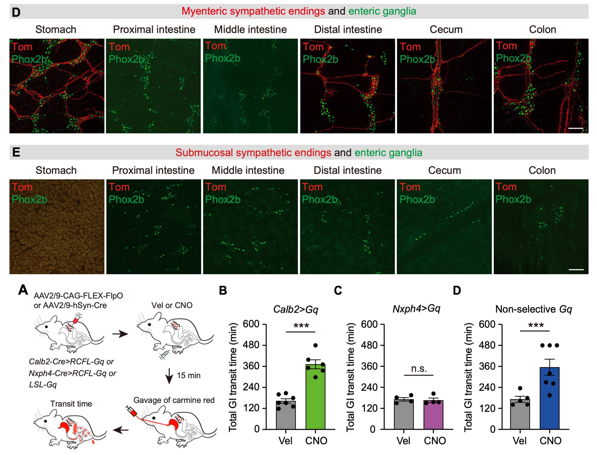 其中,CG-SMG中的Calb2阳性的神经元亚型,只对胃肠道的肌间层有投射,对胃肠道的粘膜下层和其他腹腔器官均没有投射。此外,其在胃肠道肌间层中形成的末梢类型均为围绕在肌间神经丛神经元周围的末梢类型(IGBEs)。由此提示我们,Calb2阳性神经元可能是“运动功能单元”神经元。进一步的生理功能实验印证,激活CG-SMG中的Calb2阳性神经元会显著增加胃肠蠕动时间,粪便数量明显减少。而激活Nxph4阳性神经元并不会改变小鼠的胃肠运动状态。通过投射特征和生理功能分析,证实Calb2阳性神经元确实为“运动功能单元”神经元(图3)。