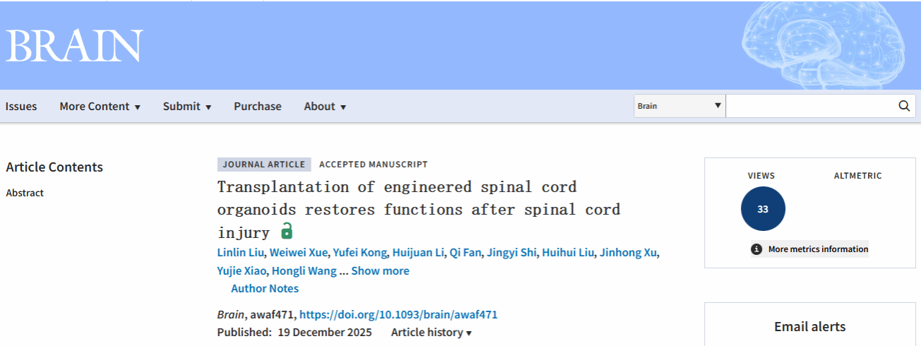 2025年12月19日,复旦大学脑科学转化研究院邵志成团队联合空军军医大学武胜昔教授在国际著名期刊《Brain》上发表了题为“Transplantation of engineered spinal cord organoids restores functions after spinal cord injury”的研究论文,在该方向取得了重要突破。这项研究不仅首次证实了基于工程化材料支撑的脊髓类器官在修复完全性脊髓损伤中的可行性与有效性,也为未来开发用于临床的“人工脊髓组织”提供了关键理论基础与技术储备。同时,该研究所构建的具备复杂结构与功能的大型类器官模型,也为研究神经发育、脊髓疾病机制及药物筛选提供了重要的实验平台,推动了神经再生医学与类器官领域的发展。