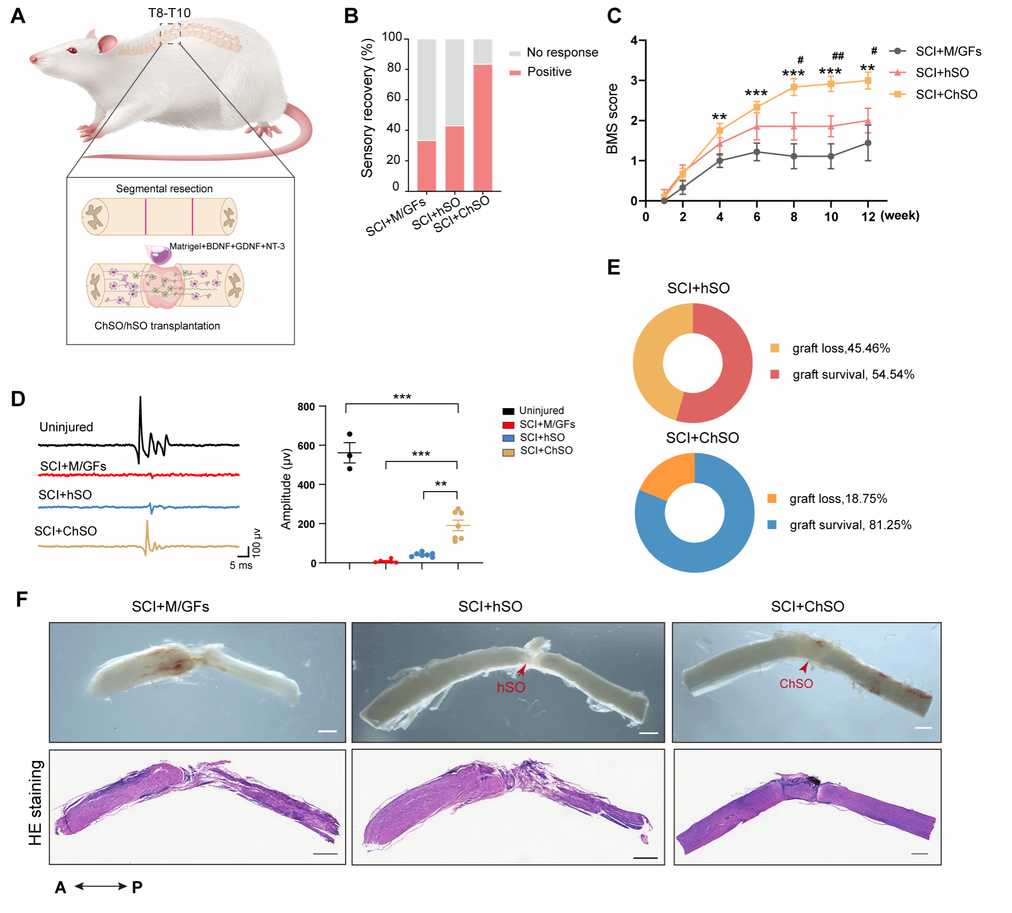 图4. 工程化脊髓类器官(ChSOs)与传统类器官(hSOs)在完全性SCI模型中的存活与功能恢复效果对比