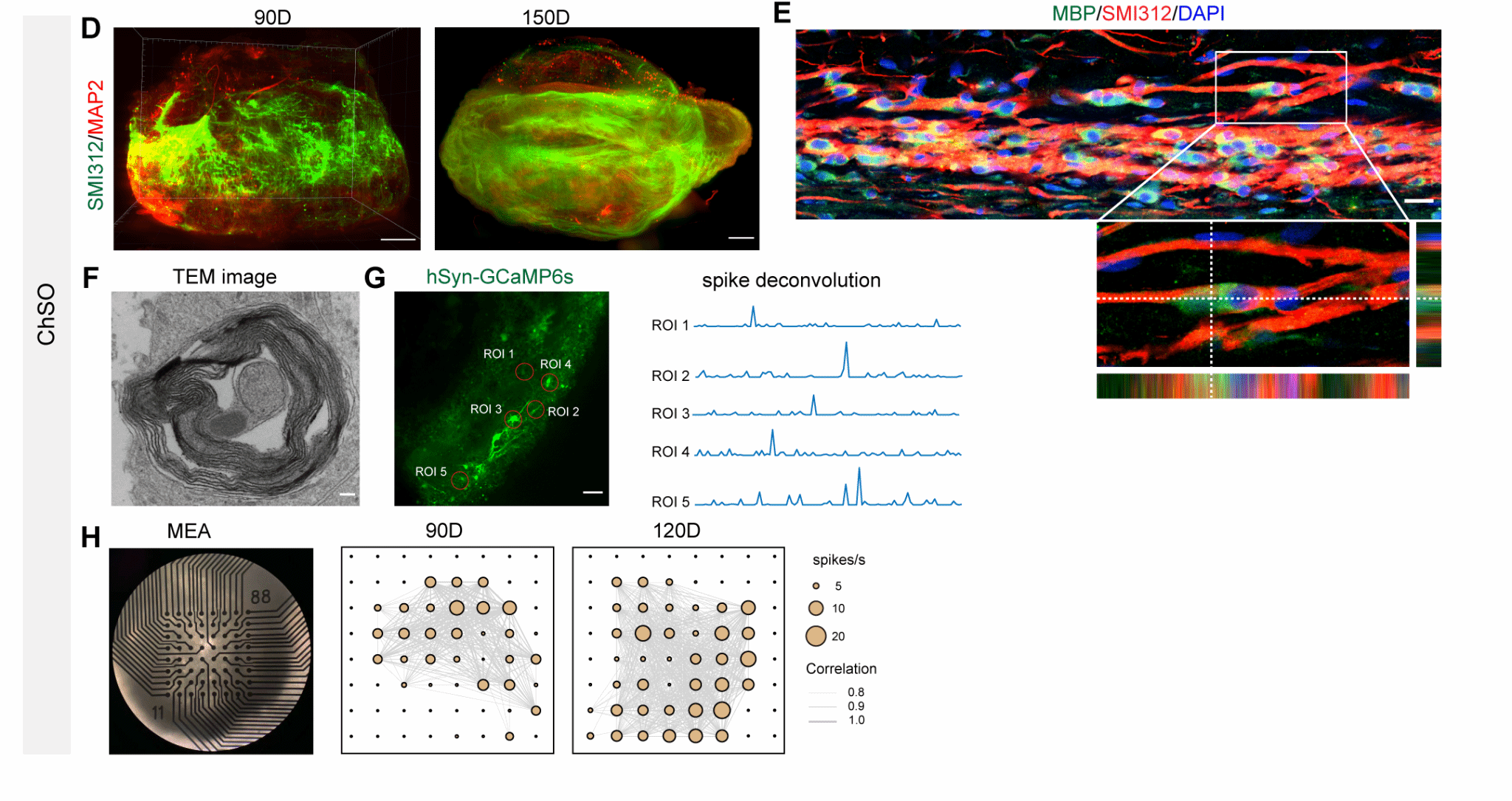 图2. 长期培养的工程化脊髓类器官展现出更成熟的神经元功能,并形成轴突束与髓鞘
