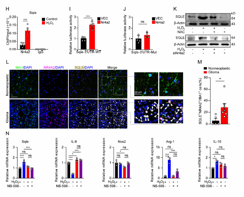 研究人员进一步通过染色质免疫沉淀富集及ChIP - seq等分析筛选出N R4A2 的下游靶点角鲨烯单加氧酶( squalene monooxygenase, SQLE ), 体内、外实验均分别验证了 N R4A2 与S QLE 在肿瘤微环境中受氧化应激的影响呈现同步变化 ,应用S QLE 的特异性抑制剂可以逆转N R4A2 介导的免疫抑制表型转变,而此种效应可以被S QLE 过表达回补;免疫荧光染色显示肿瘤组织内N R4A2 + SQLE + IBA1 + 细胞群显著多于正常组织 (图5 H-N ) 。 S QLE 作为类固醇合成代谢中的关键限速酶, SQLE的异常表达导致小胶质细胞中脂代谢的异常 ,显然, 小胶质细胞内部脂代谢环境的失衡与其免疫抑制性的产生显著相关。