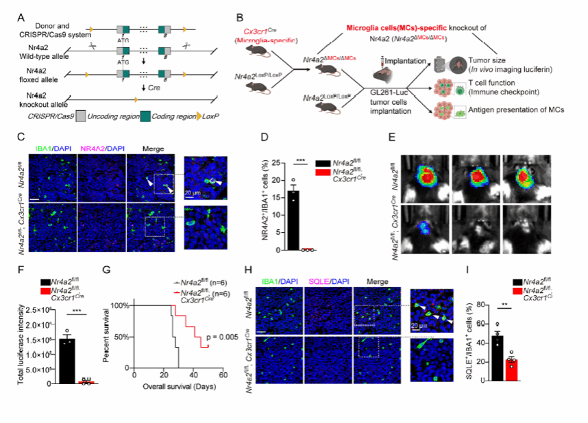 4.特异性敲除小鼠体内小胶质细胞内NR4A2重塑了免疫抑制表型的肿瘤微环境,并体现出明显生存获益