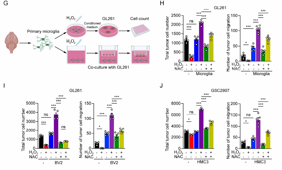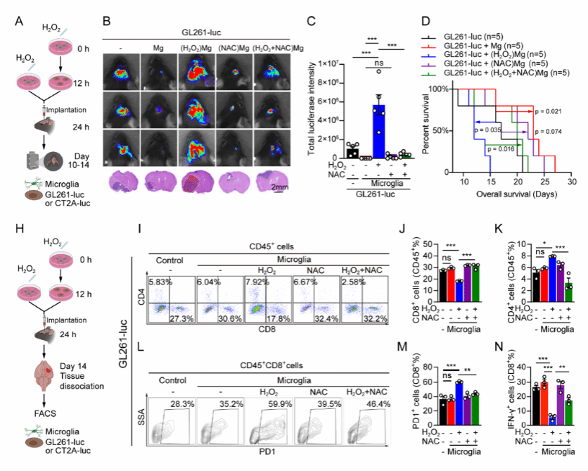 研究人员进而进一步设计了体内、外实验,通过对原代或人/鼠小胶质细胞进行过氧化物刺激(H 2 O 2 )后与肿瘤细胞共培养,确定处 于氧化应激状态的小胶质细胞 显著促进了肿瘤生长 ,且此种效应可以被抗氧化剂(N AC )所拮抗 (图2 G-J ) ,而在体内实验中,与氧化应激状态共培养后的肿瘤细胞在小鼠体内的成瘤能力显著高于阴性对照组,其微环境内的C D8 + 细胞数量明显降低、功能减退并同时伴有 免疫 检查点分子P D1 表达上调,以上所有效应亦均可被抗氧化剂(N AC )所拮抗 (图3 A-D , H -N ) , 表明处于 氧化应激状态下的小胶质细胞通过重塑肿瘤免疫微环境促进胶质瘤生长 。