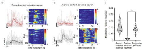 在训练过程中,约10%的神经元选择性响应奖赏性或厌恶性场景。在记忆提取过程中,研究人员再次观察到CA1神经元对全部或部分感官特征做出联合反应,但很少观察到选择性响应特定感官特征的神经元(图3),提示海马CA1中存储了场景记忆的联合表征,而缺乏特定感官特征的存储。