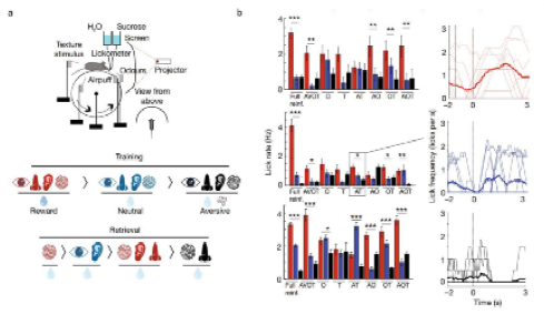 小鼠通过接受训练,将四种感官特征(听觉、视觉、嗅觉、触觉)信息组成的场景与获得奖赏(给予蔗糖)、中性(给予水)或厌恶(给予水的同时喷气)体验联系起来,在训练之后,研究人员通过舔舐频率来评估小鼠的学习情况。与中性和厌恶场景相比,在奖赏场景下,小鼠舔舐的频率显著增加,提示小鼠成功形成了场景记忆。
