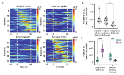 图6. AC神经元显示出感官特征选择性。a. 奖赏场景选择性神经元(上)和厌恶场景选择性神经元(下)在奖赏和厌恶探索实验中的反应。b. AC中场景选择性神经元(训练时)、特征选择性和联合反应性神经元(记忆提取时)激活的比例。c. AC和CA1中联合反应性和特征选择性神经元(记忆提取时)激活的比例。