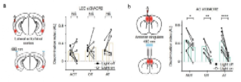 图5. AC在基于部分感官特征的记忆提取有重要作用。光遗传学抑制双侧LEC(a)或AC(b)前后小鼠在记忆提取过程中的行为学表现。