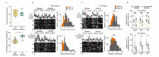 图4. AC导致海马CA1场景选择性神经元的特异性抑制。a. 抑制LEC和AC后CA1神经元(上)和CA1场景选择性神经元抑制比例(下)。b. LEC抑制前后海马CA1场景选择性神经元和非场景选择性神经元的响应(左)和比例(右)。c. AC抑制前后马CA1场景选择性神经元和非场景选择性神经元的反响应(左)和比例(右)。d. LEC抑制(上)和AC抑制(下)后场景选择性神经元和非场景选择性神经元在不同类型记忆提取试验中的激活比例。
