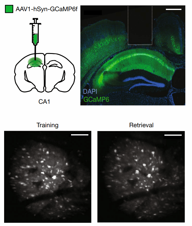 为评估海马是否编码联合表征、特定感官特征或两者兼有,研究人员给小鼠背侧CA1注射了基因编码的Ca2+探针(GCaMP6f,可用于监测神经元活动)并植入梯度折射率(GRIN)透镜,以便对训练和提取时同一视野进行双光子成像观察(图2)。