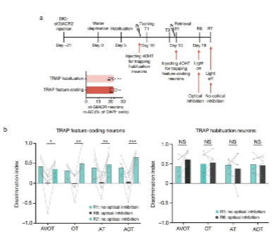 图7. AC感官特征选择性神经元在记忆提取中的作用。a. 利用TRAP技术抑制特征选择性神经元的实验范式和表达st-GtACR的AC神经元的百分比。b. TRAP小鼠在光遗传抑制特征选择性神经元前后的行为表现。