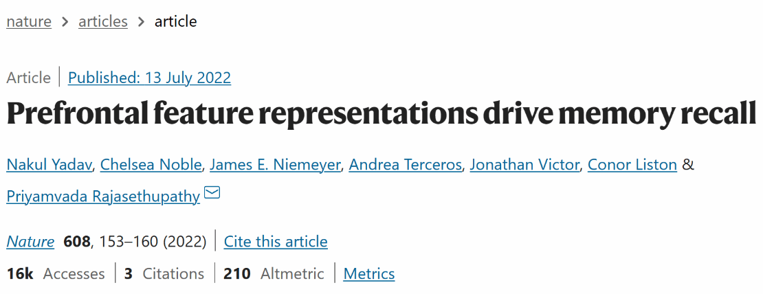 3. Yadav, N., et al., Prefrontal feature representations drive memory recall. Nature, 2022. 608(7921): p. 153-160.