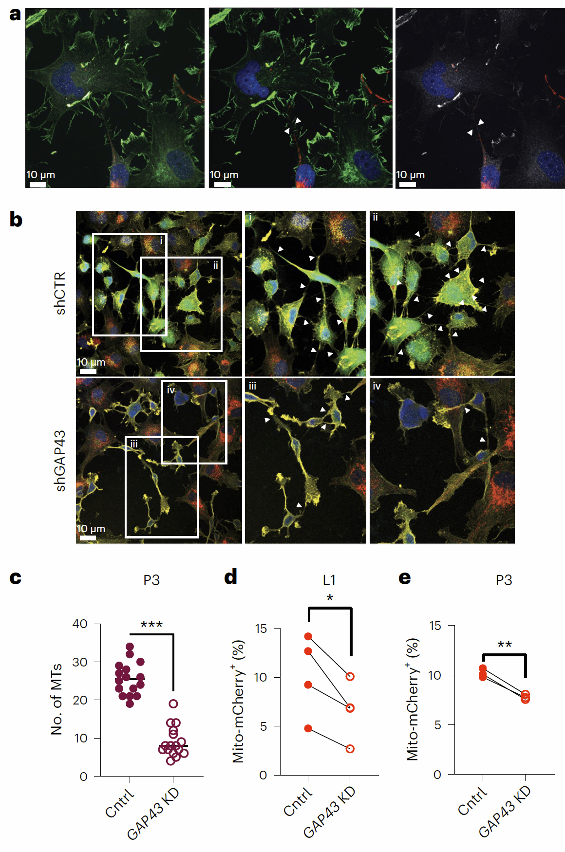 一般认为线粒体的转移主要的方式是囊泡运输或直接接触,作者通过将星形胶质细胞和多个病人来源的GBM干细胞Transwell小室共培养或接触式共培养,发现它们之间的线粒体转移必须要通过直接接触来实现(图3a)。此外,转移中的线粒体还定位在两种细胞间的TNT内(图3b),用细胞松弛素B抑制肌动蛋白后,线粒体的转移明显减少(图3c)。于是作者结合之前的研究结果,发现了GAP43在星形胶质细胞和GBM细胞之间的线粒体转移中发挥重要的作用:GAP43定位于星形胶质细胞和GBM细胞之间的TNT上(图4a),且干扰GAP43表达后,TNT数量和线粒体转移现象明显减少(图4b-e)。