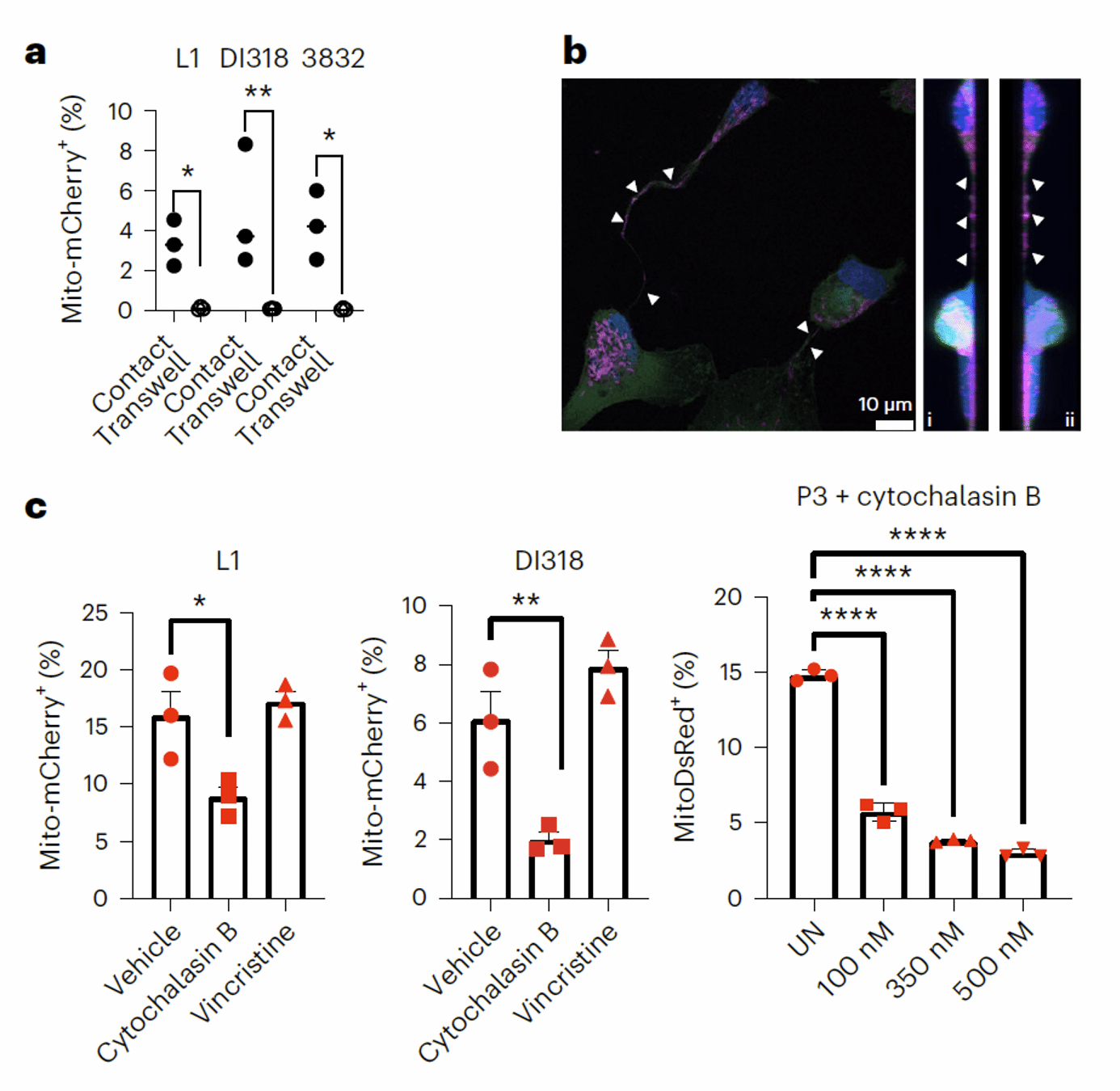 为了研究GBM微环境中的线粒体转移现象,作者首先构建了mKate2荧光蛋白和cytochrome c oxidase 8(定位在线粒体内膜)融合表达的小鼠(mito::mKate2),然后用稳定表达GFP的GBM细胞构建GBM原位小鼠模型(图1a),发现了GBM细胞可以接受来自宿主的线粒体(视频1);借助小麦胚芽凝集素(WGA)染色标记细胞表面,还发现这些转移的线粒体经常处于宿主-肿瘤细胞发生接触的位置(图1b-f)。除此之外,这些线粒体也会在GBM细胞之间转移。于是作者进一步使用小鼠GBM细胞和多种病人来源的胶质瘤干细胞,通过共培养的方法,发现提供线粒体的细胞主要是肿瘤微环境中的星形胶质细胞(图2a-d),并且在体内模型中观察到了肿瘤细胞(绿色标记部分)和星形胶质细胞(白色标记部分)紧密连接的线粒体转移区域(图2e)。
