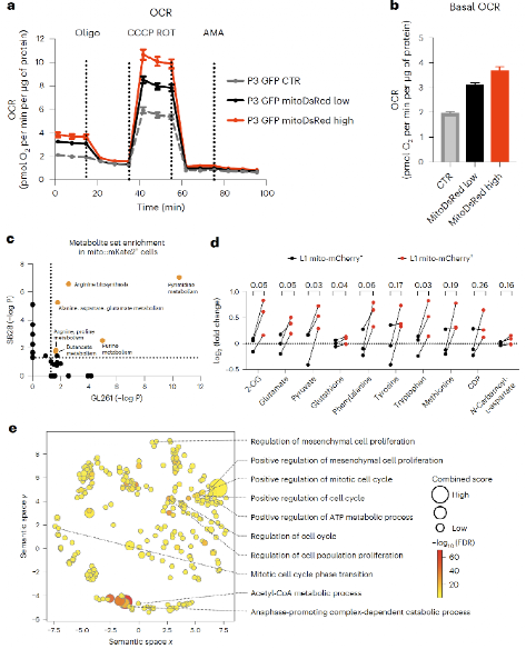 为了研究线粒体转移后对GBM的影响,作者首先使用海马代谢分析仪测定了接受了线粒体的细胞中能量代谢状况,发下接受了线粒体的细胞线粒体呼吸速率上升(图5a-b),细胞内ATP含量增多;然后作者进一步借助代谢组和磷酸化定量蛋白质组找到了包括谷氨酸、α-酮戊二酸和数种必需氨基酸等的多种关键差异代谢物和差异信号通路(图5c-e),且这些代谢物和通路都和GBM细胞抵抗氧化压力和恶性进展密切相关。最后,作者还在小鼠肿瘤模型中验证,相比于接受了线粒体的GBM模型,未接受线粒体的GBM小鼠模型有着更长的生存期。