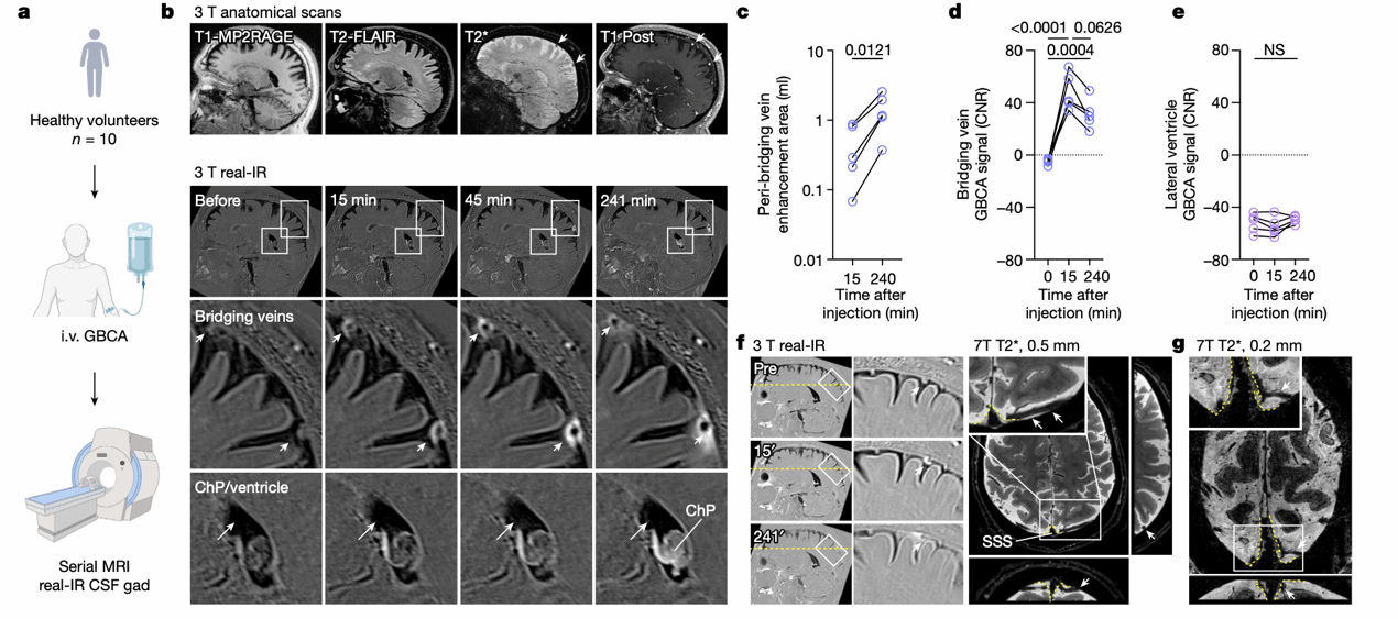 此外,作者还在人体中进一步验证了ACE点的存在。在健康人群中,real-IR MRI成像显示:静脉注射钆基造影剂(GBCA)后,示踪剂信号在桥静脉周围快速扩散增强(图4a-d)。对侧脑室区域进行成像后发现,侧脑室区域没有观察到增强,该实验排除了示踪剂通过脉络丛进入中枢神经系统的可能性(图4b,e)。进一步成像显示,增强的桥接静脉段分布在蛛网膜下腔中(图4f)。并且,桥静脉与矢状窦旁硬脑膜相连接,形成了人体中的ACE点(图4g)。