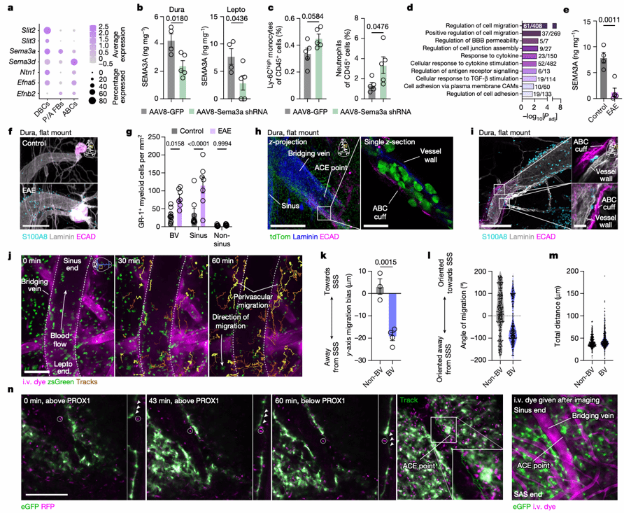 基于以上研究,作者想进一步对ACE点的作用进行分析。他推测,ACE点是免疫细胞进入蛛网膜下腔的重要通道。snRNA-seq测序数据分析显示,DBCs、软脑膜和蛛网膜成纤维细胞(p ial and arachnoid fibroblasts ,P/A FBs)、ABCs可以表达一些化学物质,其中就包括SEMA3A(图5a)。在注射 AAV8-Sema3a-shRNA 病毒之后,脑膜中单核细胞和中性粒细胞的数目增加(图5b,c)。而在 患有实验性自身免疫性脑脊髓炎(experimental autoimmune encephalomyelitis , EAE)的小鼠 中, ABC s富集与细 胞迁移和免疫 反应 相关的途径 。此外,在 EAE 小鼠的软脑膜中, SEMA3 A的量减 少, 并且 ACE点周围 的 中性粒细胞和GR-1阳性髓细胞 的 数量增加 (图5e-g)。 共聚焦成像显示,在EAE 小鼠 中,血管壁和ABC层之间 存在 免疫细胞(图5h,i),这表明免疫细胞确实可以 通过 ACE点进入 蛛网膜下 空间。 双光子成像显示,免疫细胞可以沿着桥静脉从窦向ACE点迁移(图5j-m)。此外,作者还进一步使用P rox1-eGFP/Ccr2-RFP小鼠 证明了 在EAE 条件下,ACE点的 单核细胞 可以 在硬脑膜和蛛网膜下腔 之间进行 迁移 (图5n)。