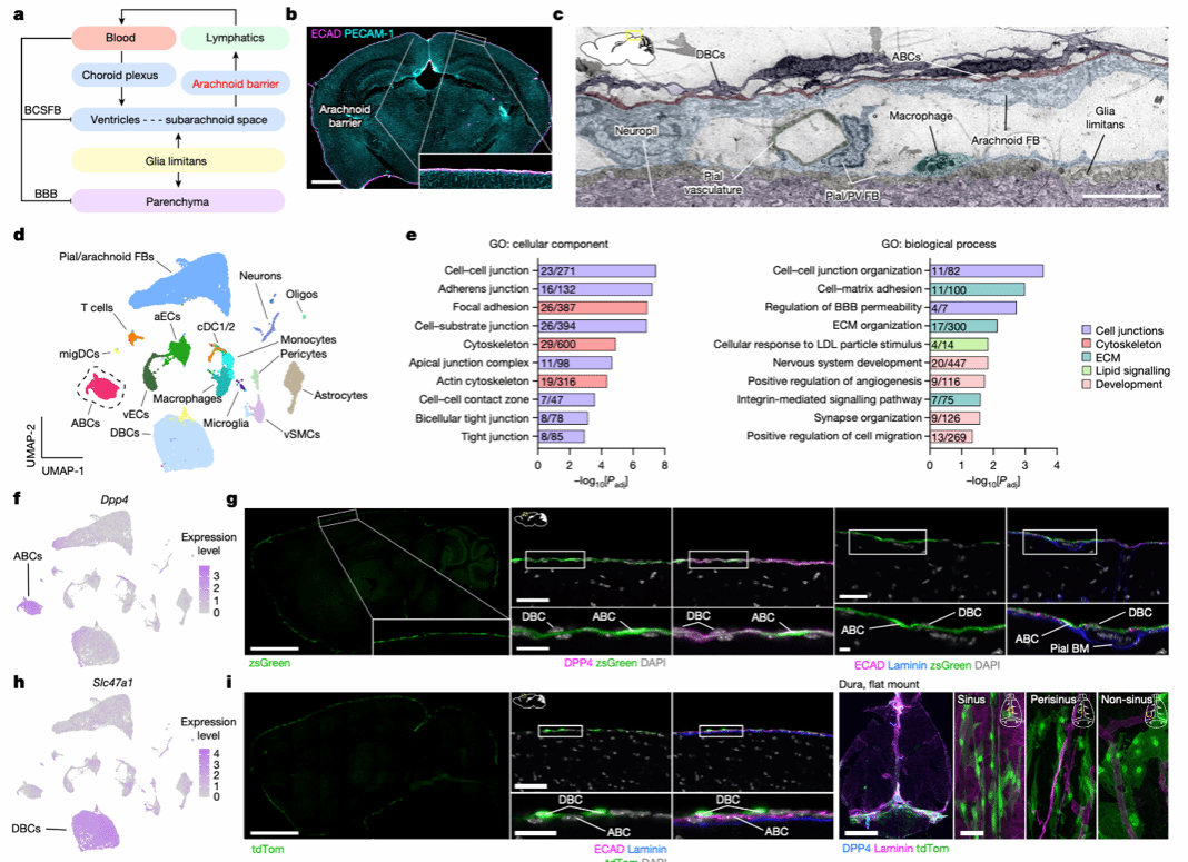 蛛网膜屏障细胞( arachnoid barrier cells , ABCs )存在于大脑边缘的薄层中,虽然数量较少,但具有重要的功能(图1 a ,b)。为了进一步探究其特性,作者剥离了脑膜细胞并进行了单细胞核转录组测序(snRNA-seq)。对 ABCs 的相关基因进行GO分析显示,该部分基因多与细胞骨架和连接形成过程相关(图1d,e)。以snRNA-seq的结果为基础,作者开发了两种转基因小鼠,分别对ABCs和硬脑膜边界细胞( dural border cells ,D BCs )进行标记,并对转基因小鼠标记的特异性进行了验证(图1f-i)。