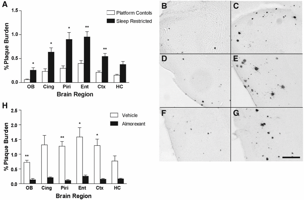 图四 小鼠慢性睡眠限制和慢性食欲素受体阻断后的Aβ斑块沉积[7] (图B、D、F为对照组嗅球、梨状皮层、内嗅皮层区域的Aβ斑块沉积,C、E、G为睡眠剥夺组)