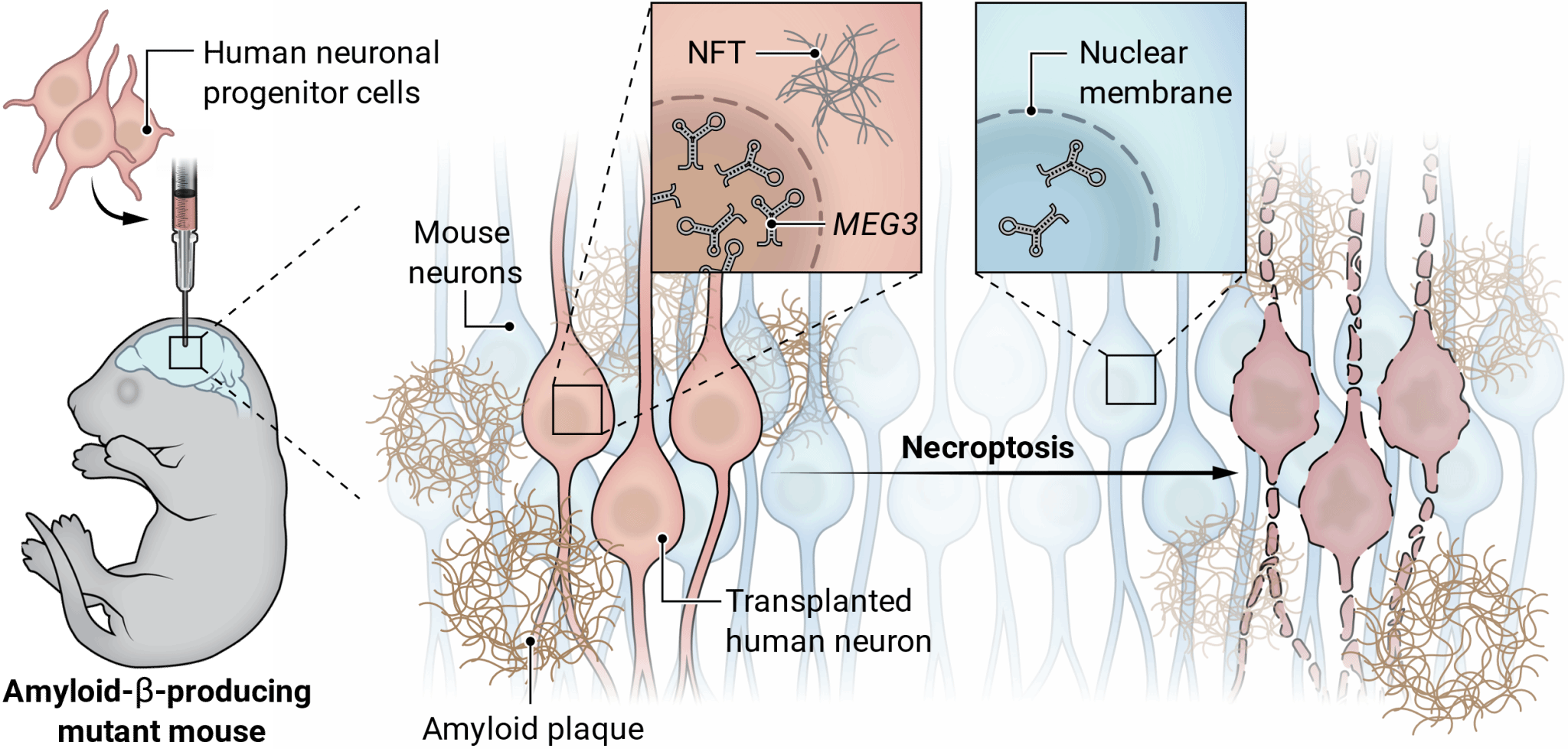 综上,这项发表于 Science 的最新研究,通过将人类或小鼠神经元移植进淀粉样蛋白小鼠模型的大脑中,发现只有人类神经元表现出严重的阿尔茨海默病病理并发生坏死性凋亡,而MEG3的急剧上调是其关键因素。该研究揭示了人类神经元对AD的独特易感性,也提示我们或许可以对小鼠的内源性神经元进行基因改造,使得小鼠的MEG3也能够响应Aβ病理,从而开发出新的AD小鼠动物模型。