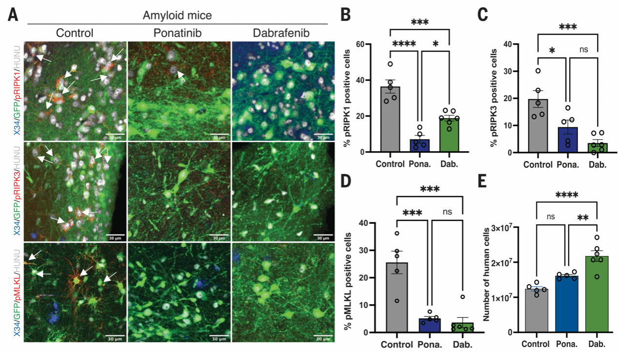 进一步,研究者企图探究MEG3介导的坏死途径是否也在体内介导了异种移植人源神经元的丢失。研究者在移植后第2个月至第6个月,给异种移植小鼠口服坏死性凋亡激酶抑制剂ponatinib和dabrafenib进行治疗(ponatinib是是RIPK1和RIPK3抑制剂,已被FDA批准用于治疗急性淋巴细胞白血病和慢性髓细胞白血病;dabrafenib是一种特异性更强的RIPK3抑制剂)。研究发现,移植后第6个月,两组治疗组小鼠的程序性坏死蛋白(pRIPK1、pRIPK3和pMLKL)水平相较未治疗组均大幅降低,dabrafenib组小鼠神经元死亡也显著减少。