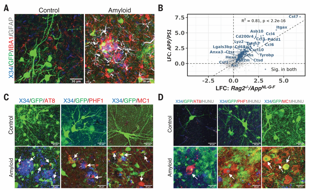 研究团队首先基于先前的Nod-SCID小鼠的异种移植模型作出了改进,他们使用Rag2-/- (Rag2tm1.1Cgn) 免疫抑制遗传背景和单个AppNL-G-F (Apptm3.1Tcs/Apptm3.1Tcs) 敲入基因来驱动Aβ病理,构建了Rag2-/-/AppNL-G-F淀粉样蛋白小鼠模型以接受人类干细胞来源的神经祖细胞(NPC)移植。