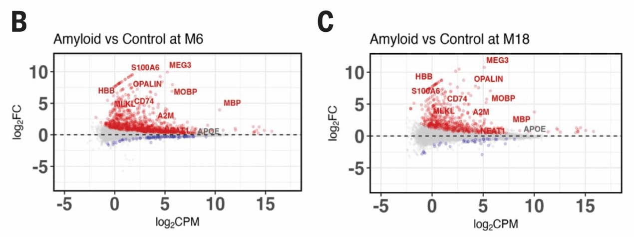 那是什么在驱动神经元程序性坏死呢?研究者在暴露于淀粉样蛋白的异种移植人类神经元中发现了数十个表达改变的长链非编码RNA,其中上调幅度最显著(超过10倍)的MEG3引起了研究者的关注。MEG3通过p53参与细胞死亡途径,虽然此前从未有研究认为MEG3参与AD,但研究者在单细胞核转录组数据库中发现,AD患者大脑中存在MEG3上调的现象。