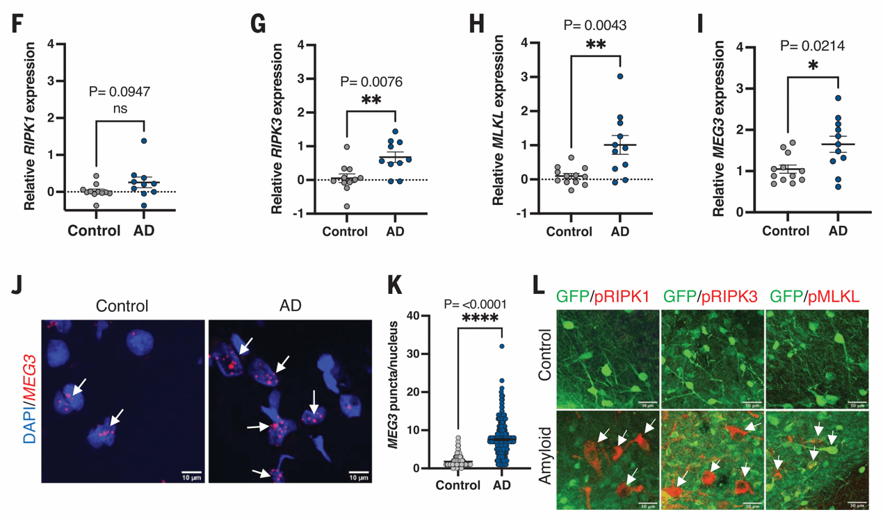 为了回答这个问题,研究者分离出了移植后2、6和18个月时小鼠的异种移植人源神经元,进行RNA测序。研究者并未观察到与细胞凋亡或铁死亡有关的基因表达变化,但结果显示程序性坏死执行蛋白MLKL表达上调,qPCR检测AD患者颞回脑样本也验证了MLKL和RIPK3的显著上调,证实了程序性坏死的存在。