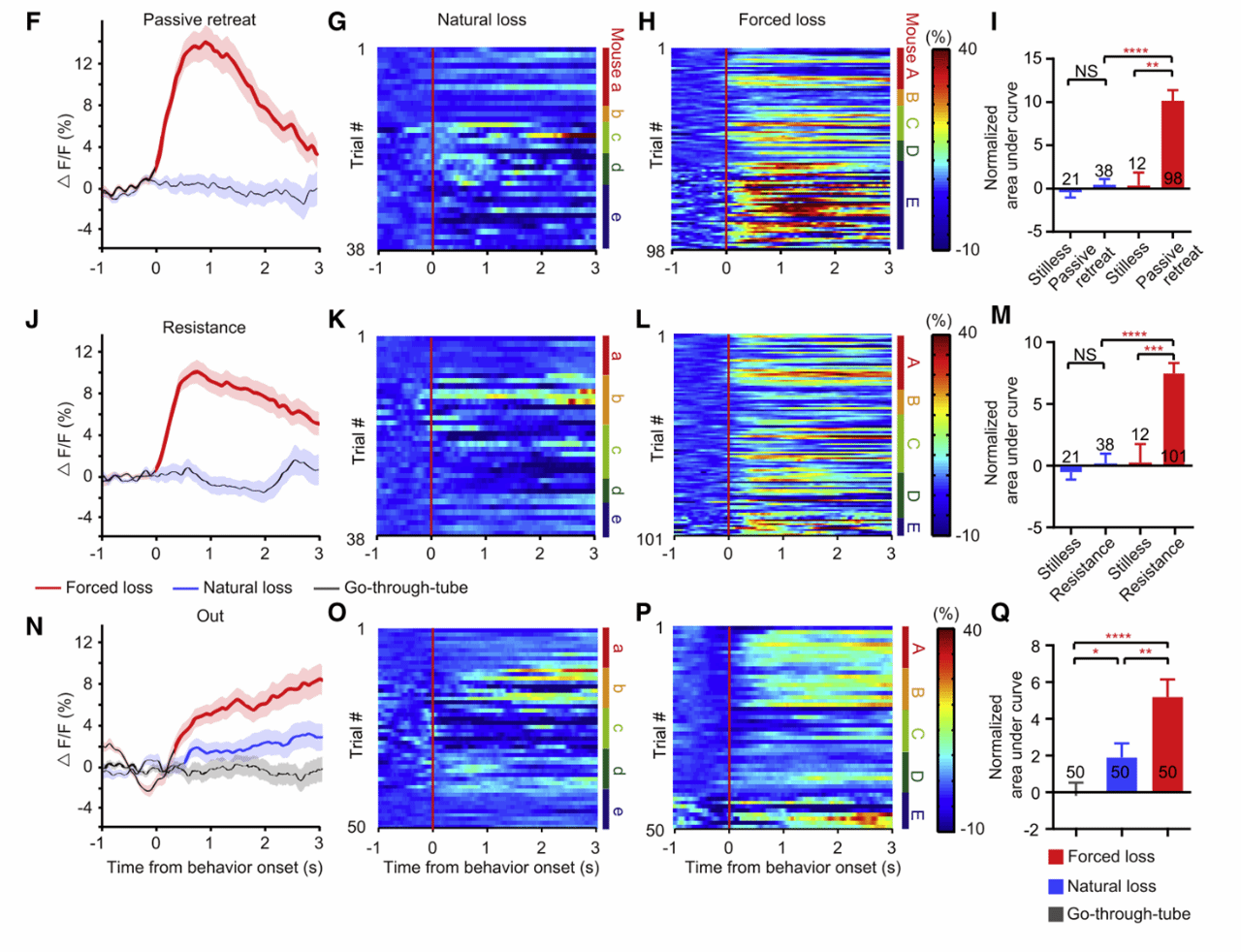 研究者将“鼠王”意外输给他的小弟们的行为称为“触发负性奖赏预测误差”(reward prediction error,RPE),。他们通过对“鼠王”LHb脑区进行钙信号记录来分析发现,“鼠王”强迫失去社会地位的负性RPE与LHb及其上游输入息息相关(图6)。