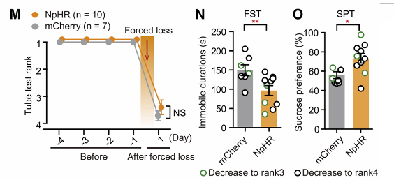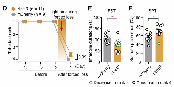 然而,内侧前额叶皮层(medial prefrontal cortex, mPFC)是编码社会竞争的重要脑区[6],激活mPFC可以使落败的“鼠王”重新振作起来,在之后的竞争中重拾王位,胜利次数多了之后抑郁样行为会显著减少 (图9)。