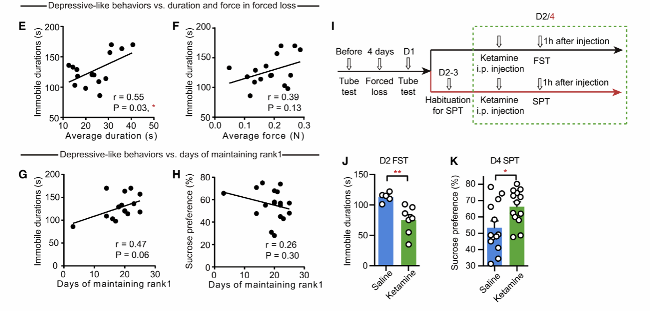 无奈之下,这只抑郁的“鼠王”只能接受抑郁药物治疗,—氯胺酮(ketamine)是一种快速治疗抑郁症的药物[1],。研究者给被迫失去社会地位的小鼠曾经的“鼠王”注射氯胺酮(ketamine)后,发现小鼠的其抑郁样行为竟然神奇地被逆转了,恢复了昔日的能力(图4)。
