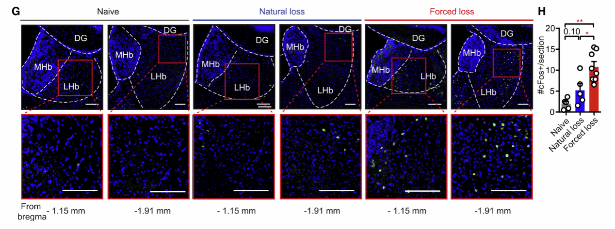 于是,研究者们关注到了与厌恶刺激相关的外侧缰核(lateral habenula ,LHb)[2,3],被迫失去社会地位的“鼠王”比因遭遇强者而失败的小鼠激活的神经元更多(图5)。