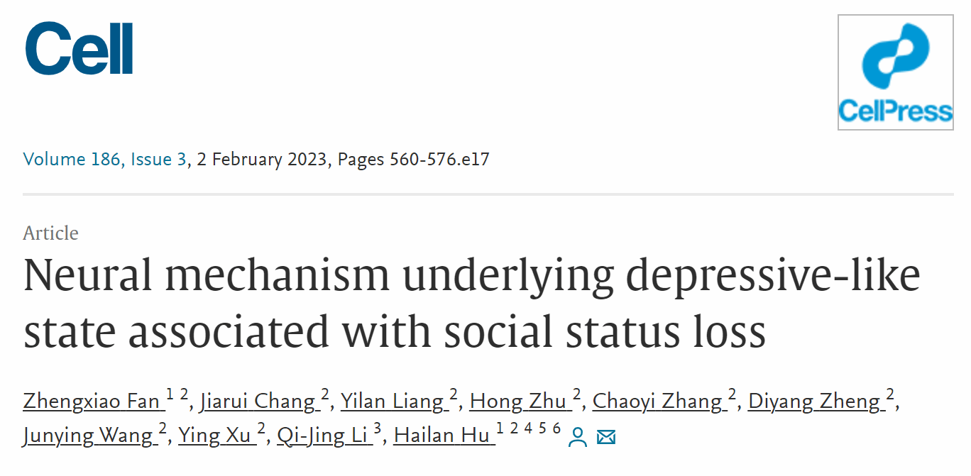 这是一场科学家们精心筹划的谋局,这场谋局是发表在顶尖学术期刊《Cell》杂志上(图2),题目是“Neural mechanism underlying depressive-like state associated with social status loss”的神经科学领域的重大发现。该发现是由浙江大学胡海岚教授领衔的研究团队,通过建立一种优势等级下降的抑郁症小鼠模型,探索鼠王被迫陨落过程背后的关键神经机制。
