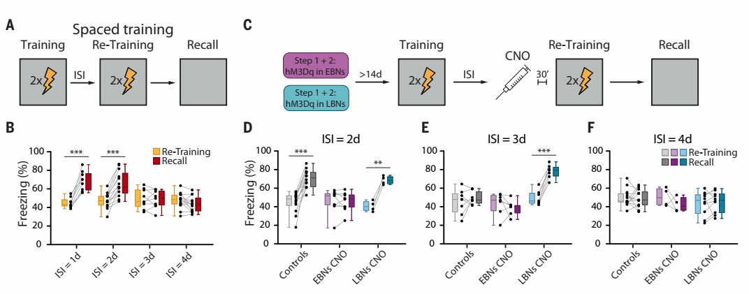 基于上述发现,接下来研究团队进一步探讨了LBNs到EBNs的招募转变是否会影响记忆的可塑性。如果小鼠能够整合多个学习事件的信息,那么在同一背景下进行一次两个US的记忆获取应该会强化第一次实验中学习到的条件刺激CS与US的关联。这是否会增加小鼠回忆时的僵直行为?接下来,研究者测试了再训练过程中EBNs和LBNs的差异性招募是否支撑这一过程。实验结果表明,动物在接收到第二次学习信息时,会在特定的时间窗口内有效整合过去的经历,强化之前的记忆(图5C-D)。这一发现意味着,我们的大脑具有灵活的学习和记忆调节能力,为后续学习提供有利的条件。