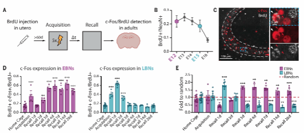 为了研究海马胚胎发育过程中定义的神经元集群对场景恐惧记忆编码的影响,研究者首先使用脉冲追踪法(pulse-chase method)对特定时期形成的神经元集群进行标记;然后识别出在场景恐惧记忆(contextual fear conditioning, cFC)各个阶段中招募的c-Fos+神经元群体(图1A-E)。为了捕捉在注射时形成的神经元集群,研究者在孕鼠不同的胚胎日(E-days)注射了5-溴-2′-脱氧尿苷(BrdU),然后等小鼠成年(>P60)后进行cFC训练。在cFC中,训练场景CS与厌恶刺激电击US可以快速编码,从而使小鼠形成恐惧记忆,这种恐惧记忆的属性随着时间演变遵循一致的轨迹,从而可以用来研究记忆的动态编码。