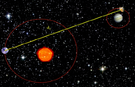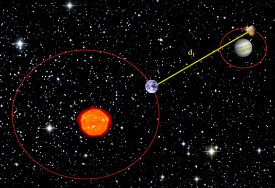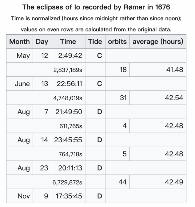 伽利略卫星的日食现象被视为一个精确的天文时钟,引发了一系列观测浪潮。1676年,丹麦天文学家罗默( Ole Roemer )经过长时间观察,发现地球在K点时观测到的木卫一日食现象比在L点观测到的约晚三分钟半。 地球的位置 相对于 木卫一的轨道周期长度没有影响,所以一定有其他因素导致了他所看到的 日食开 始时间的差异。就在那时,罗默意识到他所看到的是光在木卫一和地球之间传播所需的时间差异。 如果光速是有限的,就能够解释这一点:当地球靠近木星时,观察到的木卫一日食间隔缩短;远离时,木卫一日食间隔延长。