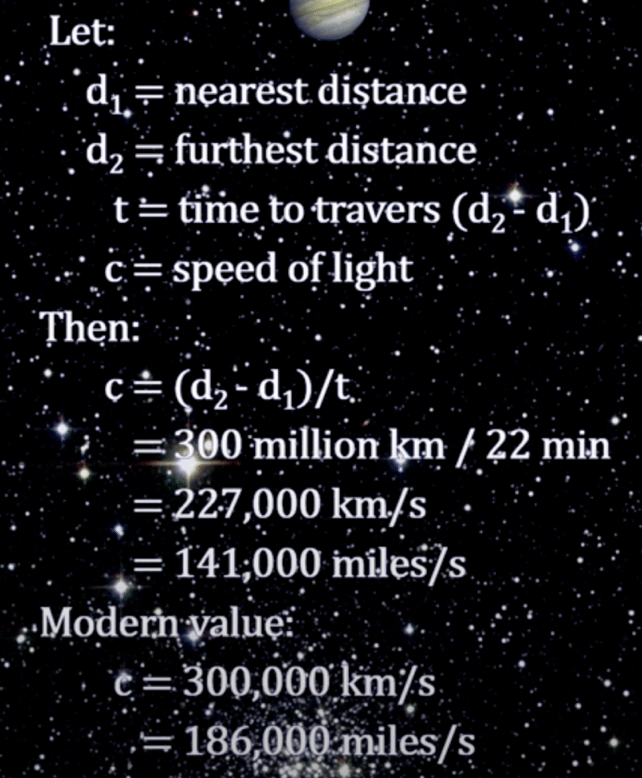 18世纪初,科学家们根据进一步计算出光速约为每秒227,000公里[2]。计算方法如下图: