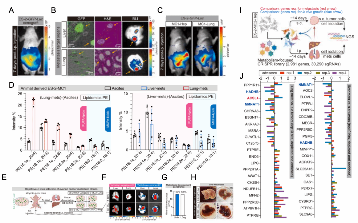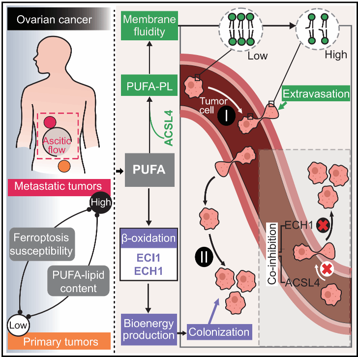在小鼠卵巢癌转移模型中,经过两轮体内筛选,研究者通过代谢相关的基因筛选发现,ACSL4(一种合成长链脂肪酰辅酶A的酶)是促进血源性转移的关键因素。ACSL4通过增强细胞膜的流动性和细胞的侵袭性,促进了转移灶的形成。