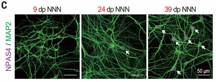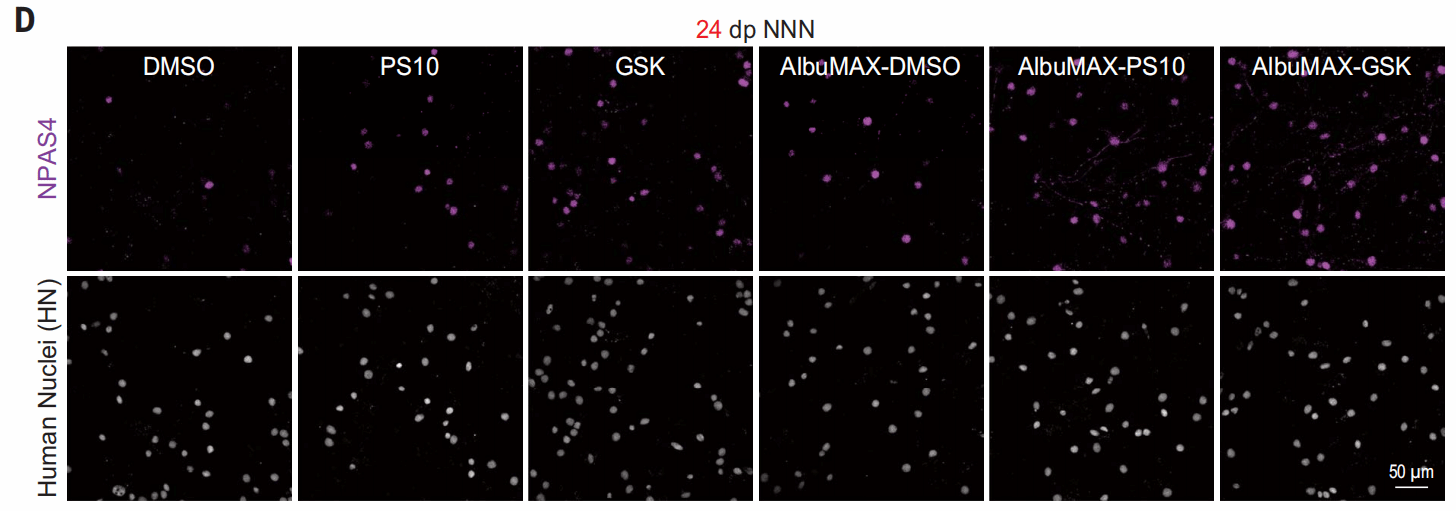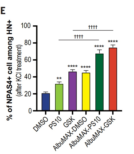 在给予GSK或AlbuMAX后,NPAS4+的细胞比例增加,表明神经元成熟加速。并且,AlbuMAX和GSK的作用是相加的。