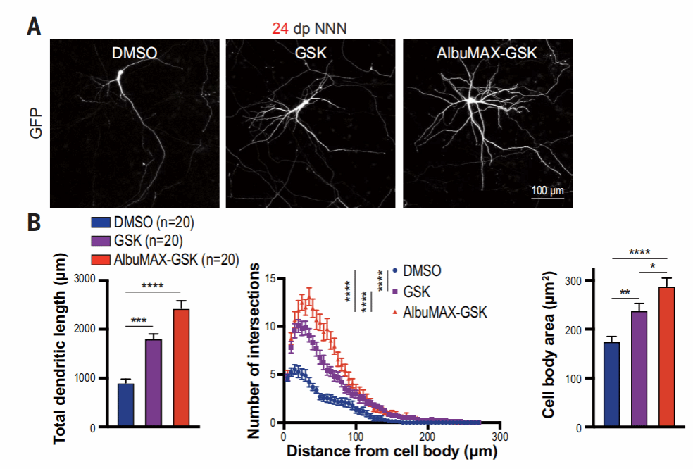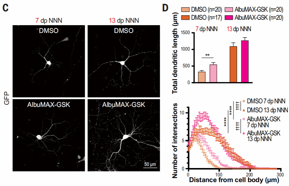 AlbuMAX-GSK处理后,人皮质神经元的大小、树突长度和复杂性都有明显增加。经过处理后,神经元在第24天达到了对照组第58天的成熟水平,表明增强线粒体代谢可以加速神经元的形态发育。
