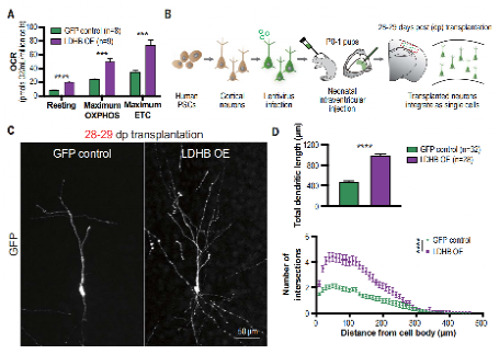 于是,作者又尝试在体内观察。将人皮质神经元移植于小鼠脑皮层,慢病毒过表达LDHB(促进乳酸向丙酮酸的转化)。可以看出,过表达LDHB导致体外培养的神经元线粒体OCR增加,将该神经元移植后,在第四周可以观察到明显的树突长度和复杂性增加,这相当于对照条件下2至3个月的成熟程度。