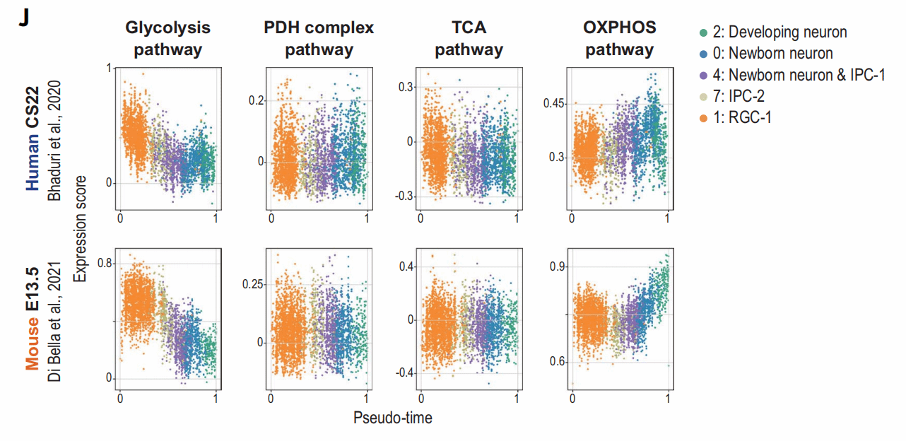 至此,我们已经发现了神经元成熟过程中的线粒体代谢差异,接下来,为了进一步探究差异形成的原因,作者们回顾了之前的单细胞测序数据,可以看出,在人和小鼠体内,随着时间的增加,与OXPHOS相关的基因总体增加,与糖酵解相关的基因减少,而且这一现象在小鼠细胞中发生得更早,这也解释了之前观察到的线粒体活性差异。