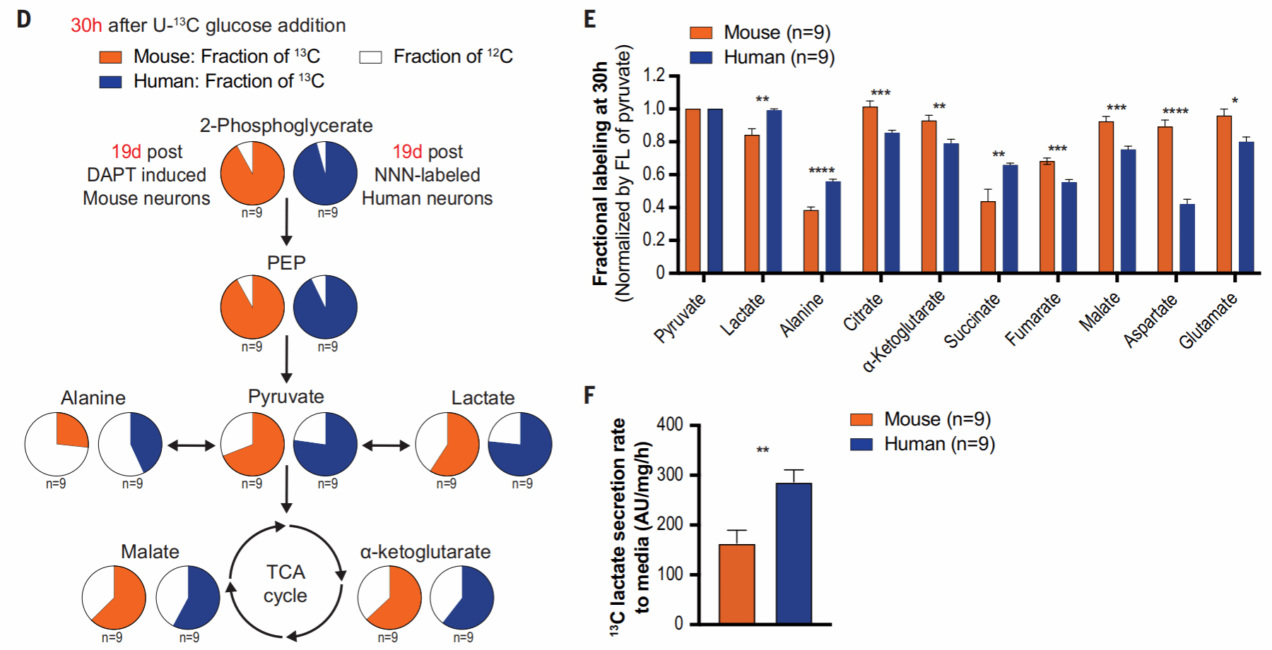 接下来,作者又使用了碳13质谱方法监测了人和小鼠皮质神经元的糖代谢。